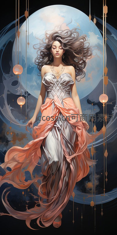 一位女子在满月背景下翩翩起舞,银粉相间的长裙随风飘扬,周围悬挂着温暖灯笼,营造出神秘而浪漫的氛围。