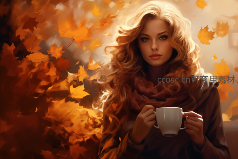 在漫天飞舞的橙黄色秋叶中,一位金发女子轻裹围巾,双手捧着白色咖啡杯,眼神温柔,营造出浓郁的秋日浪漫氛围。