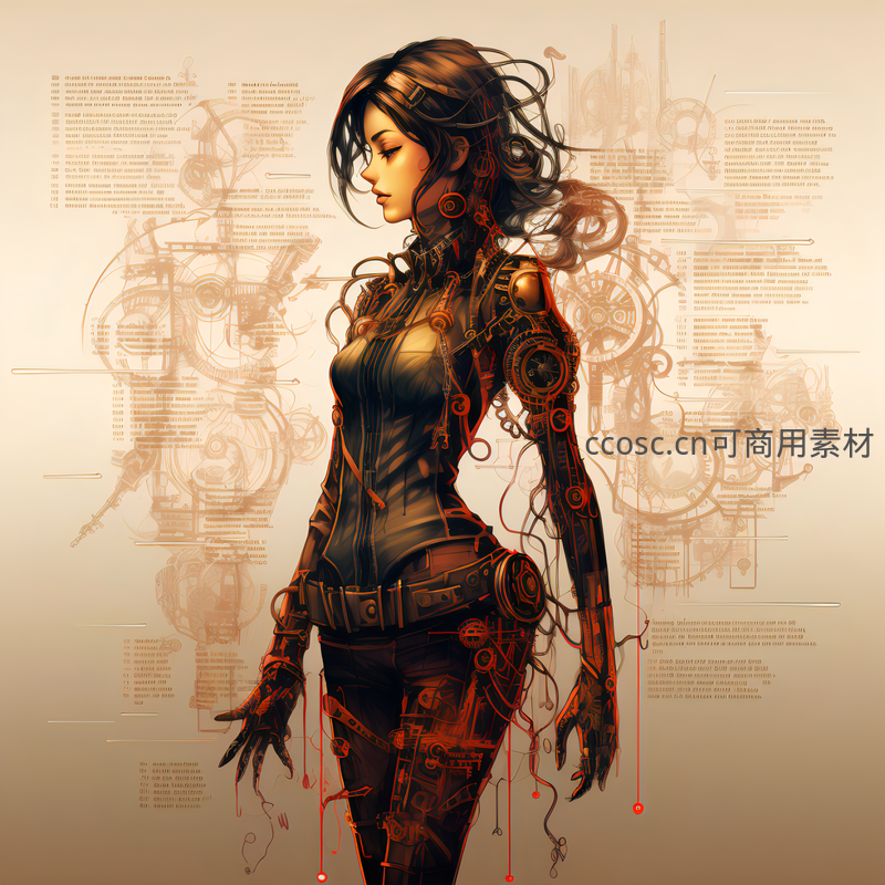 一位融合了人体与机械结构的女性战士,立于充满复杂数据和电路图的科技背景前,展现出强烈的未来科幻与力量感。