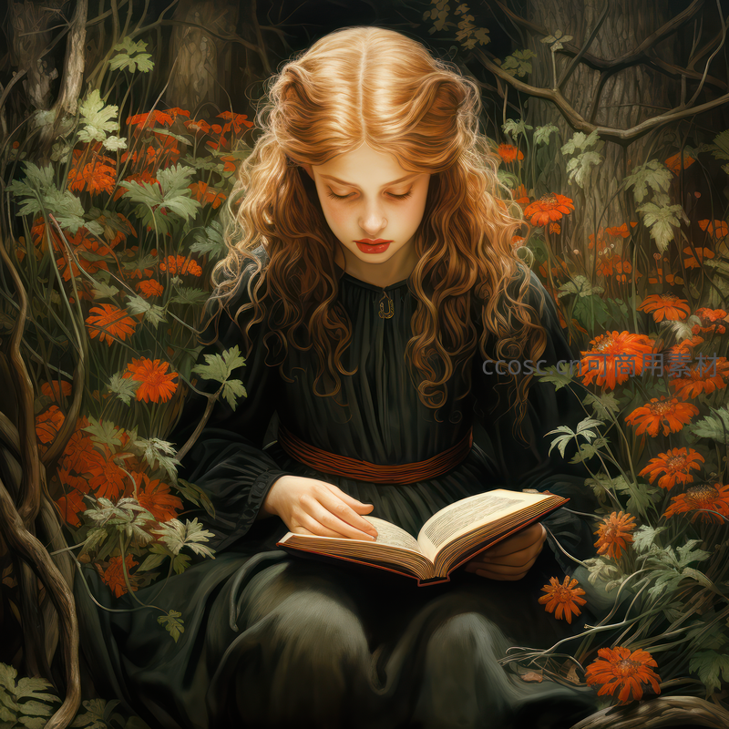 红发少女坐在开满橙色野花的幽暗森林中专注阅读一本古籍,仿佛正在学习古老的魔法咒语,氛围静谧而神秘。