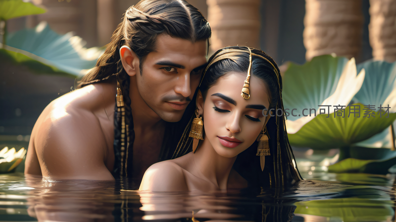 一对身着华丽古埃及服饰的恋人,在开满莲花的静谧水池中深情相拥,阳光洒落水面,营造出古老而神圣的爱情氛围。