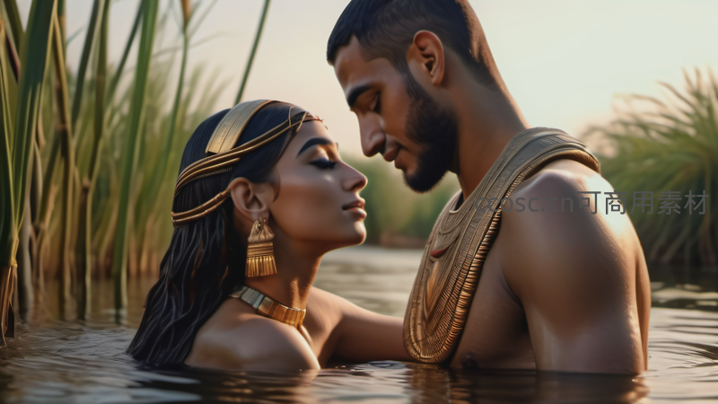 在夕阳映照的芦苇荡中,一对古埃及恋人半身浸于水中,彼此凝望,神情温柔缱绻,尽显跨越千年的浪漫与宁静。