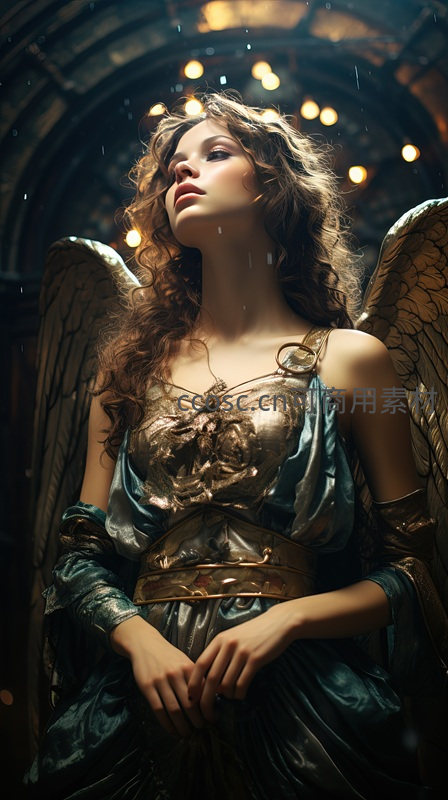 一位身披华美金蓝长袍的天使,展开巨大羽翼,在穹顶洒下的光雨中静谧仰望,神情神圣而安详,周身弥漫着超凡脱俗的圣洁气息。
