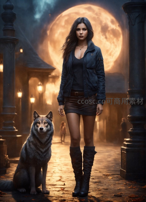 一轮巨大的满月悬挂在古老街道上空,一位身着皮衣和长靴的女子与一只威严的狼并肩而立。昏黄的路灯映衬出神秘氛围,仿佛置身于奇幻都市的深夜传说。