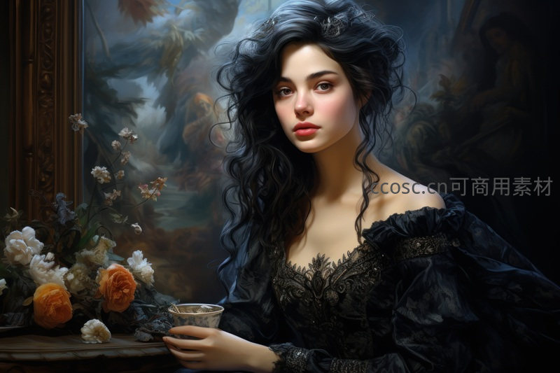 黑发如瀑的女子身着华丽黑裙,在繁花与古典油画背景中轻握茶杯,神情宁静,仿佛从古典画卷中走出的优雅佳人。