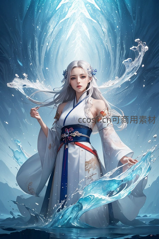冰晶女神立于水浪之巅,银发飞舞如仙