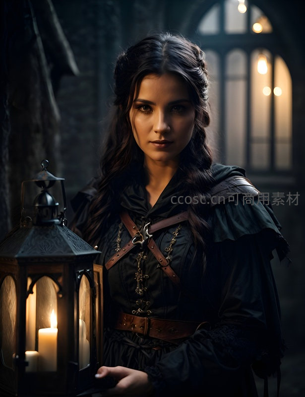 身着黑色哥特风服饰的女子手持古朴灯笼,立于幽暗石廊之中,烛光摇曳映照其深邃眼眸,氛围神秘而庄重。