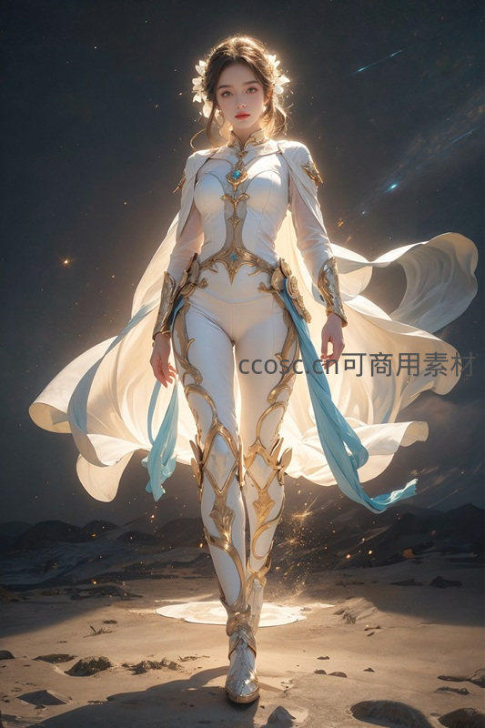 身披白金战甲的圣女立于荒漠之上,背后光翼轻扬,星辰为幕,她目光坚定,仿佛正从宇宙深处降临人间,带来神圣与希望。
