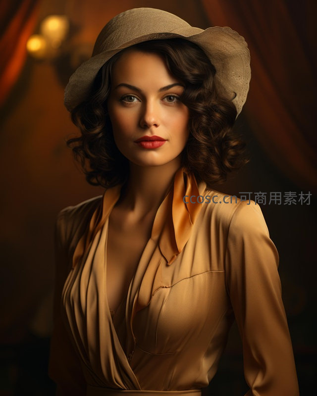 一位身着丝质棕黄色连衣裙、头戴宽檐草帽的女性,在暖色调灯光下凝视镜头,卷发与红唇尽显上世纪好莱坞的迷人风情。