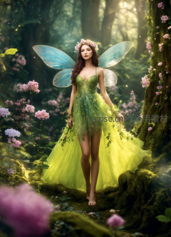 一位身着翠绿长裙、背生透明蓝翼的精灵,在阳光穿透的幽静森林中缓步前行,四周繁花似锦,苔藓覆盖的树干与柔和光影交织出童话般的魔幻氛围。