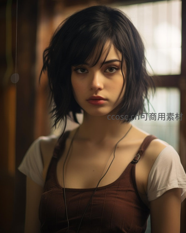 一位黑发齐肩的年轻女子站在温暖的木质房间内,身穿白色T恤和棕色吊带,颈间挂着耳机线,目光直视前方,神情平静而略带思索,背景虚化突出人物主体。