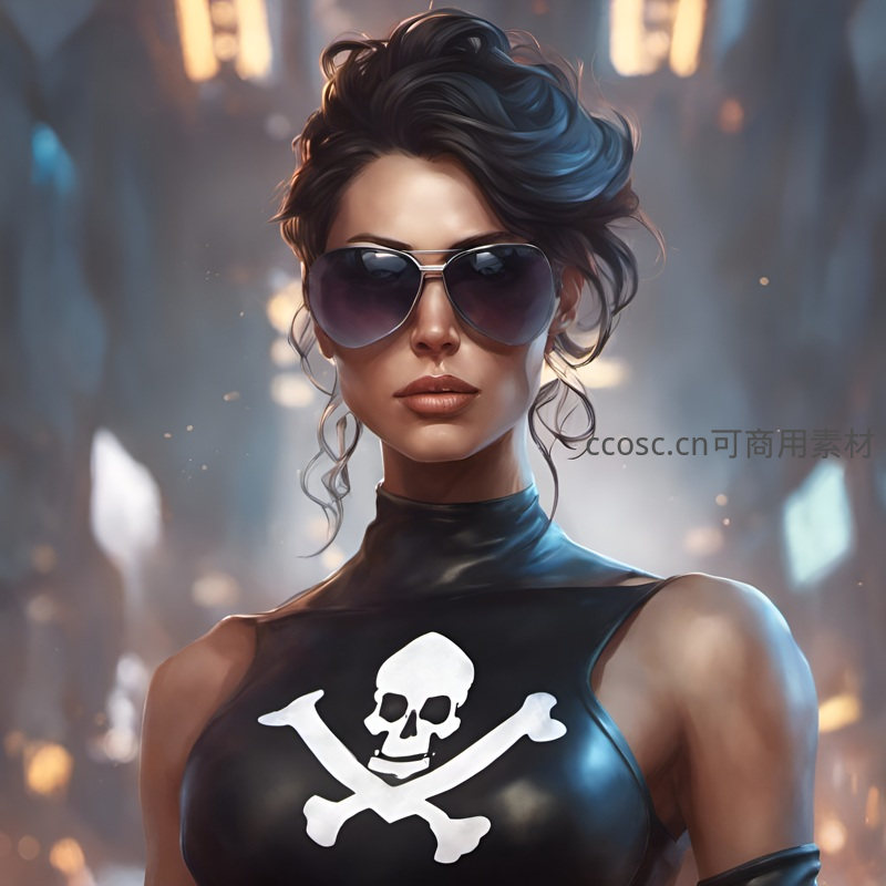 一位戴着飞行员墨镜的女性,身穿印有醒目骷髅图案的黑色紧身衣,发型凌乱,眼神坚定,散发着强烈的未来感与不羁的帅气。