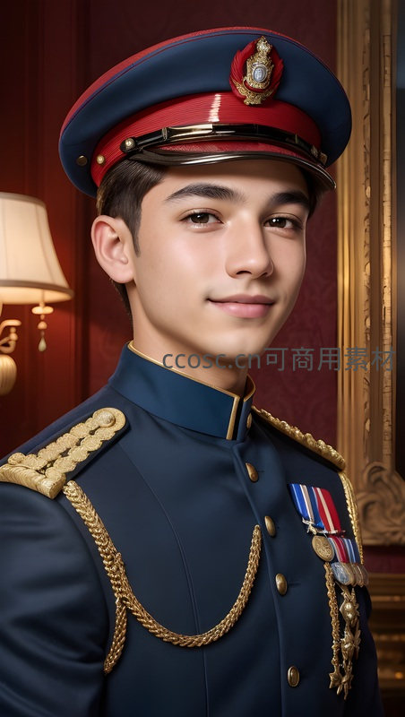 一位年轻的军官身着深蓝色镶金边的正式礼服,佩戴着红色帽徽和多枚勋章,面带微笑,背景是古典的室内环境,尽显庄重与英俊。