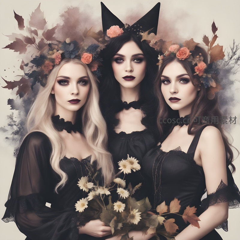 三位身着黑色礼服的女子,头戴由秋叶与鲜花编织的花环,中间者佩戴猫耳,她们手持一束白色雏菊,神情庄重,背景弥漫着古典与神秘的气息。