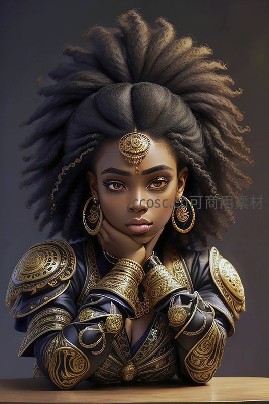 一位身着华丽金色盔甲的非洲女性,蓬松卷发高耸,眼神坚定而深邃,尽显王者气场与文化自信,融合传统与现代美学。