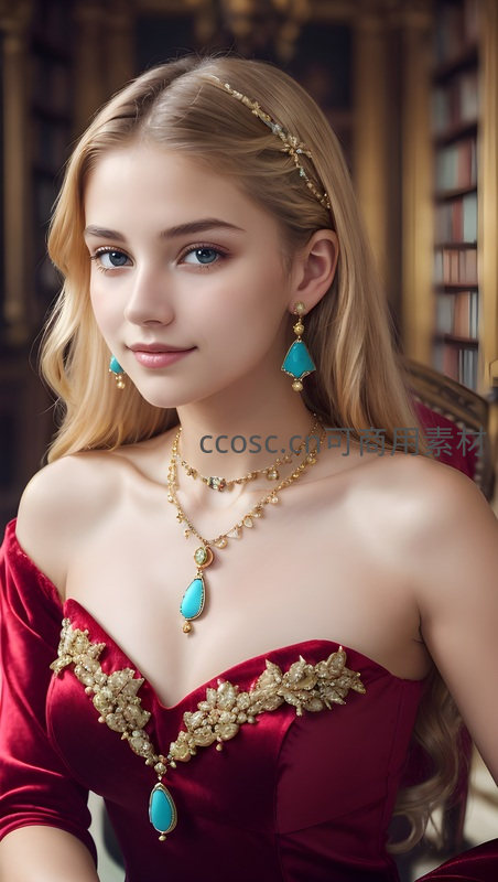 一位金发少女身着华丽的红色礼服,佩戴精致的蓝宝石与黄金首饰,在古典图书馆背景中展现高贵典雅的气质。