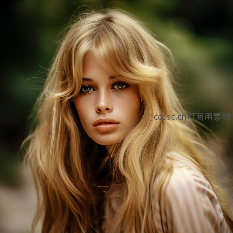 一位拥有蓬松金色长发的少女,在模糊的绿色自然背景下回眸凝望镜头,眼神清澈,面容柔和,充满青春与自然的美感。