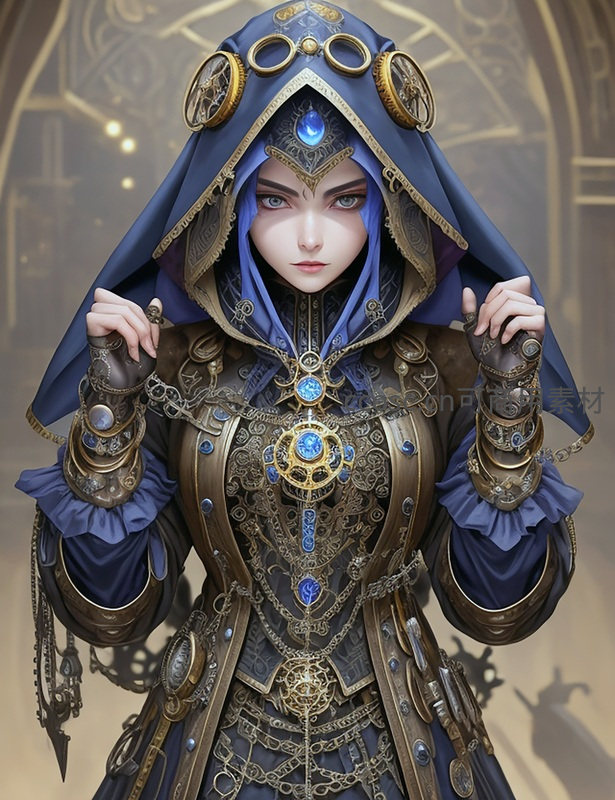蓝袍女祭司身披华丽铠甲,头戴神秘法冠