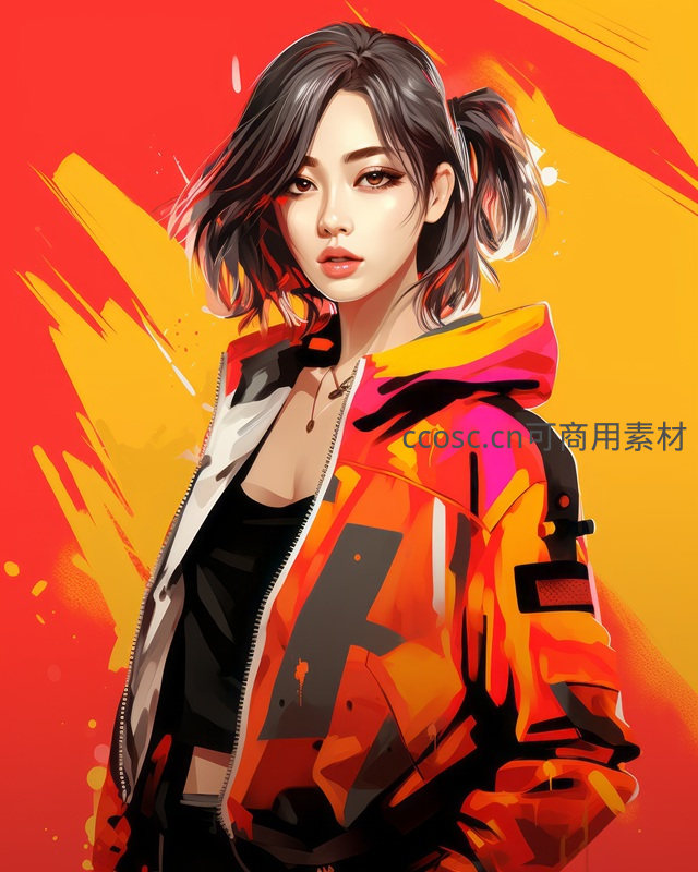 女孩扎着高马尾,身穿橙黑拼接夹克,站在火焰般的红黄背景前,眼神坚定,散发出无畏与力量的气息。