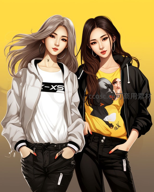 两位风格迥异的少女并肩而立,一位银发白衣,一位黑发黄衫,共同诠释了现代街头潮流的活力与个性。