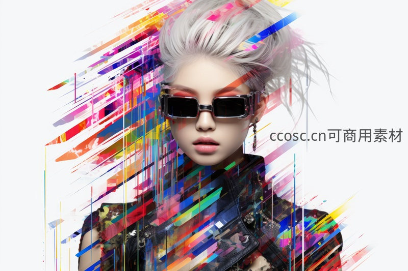 银白色短发女孩佩戴墨镜,周身环绕着动态的彩色光束特效,整体造型融合了科技感与街头朋克元素,彰显出无畏自信的酷炫气质。