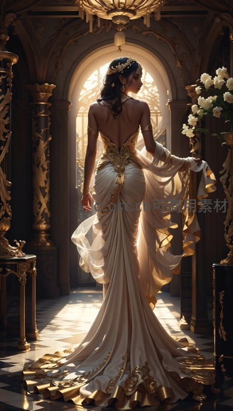 一位高贵的新娘背对镜头,身着缀满金线的拖尾长裙,站在阳光洒落的古典宫殿拱门下,姿态优雅,尽显婚礼的庄重与奢华氛围。