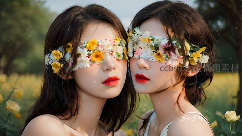 两位面容相似的少女并肩立于阳光洒落的花田中,双眼被五彩鲜花制成的花环遮盖,红唇微启,尽显浪漫与纯真。