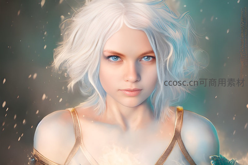 一位拥有银白色长发和深邃蓝眸的冰雪精灵,头戴雪花冠冕,周身飘散着晶莹雪花,眼神宁静而神秘,仿佛来自童话世界的守护者。
