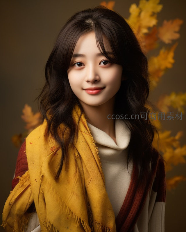 黑发女孩围着黄色围巾,面带温柔微笑,背景是飘落的秋叶,整体氛围温馨舒适,传递出秋日特有的宁静与美好。