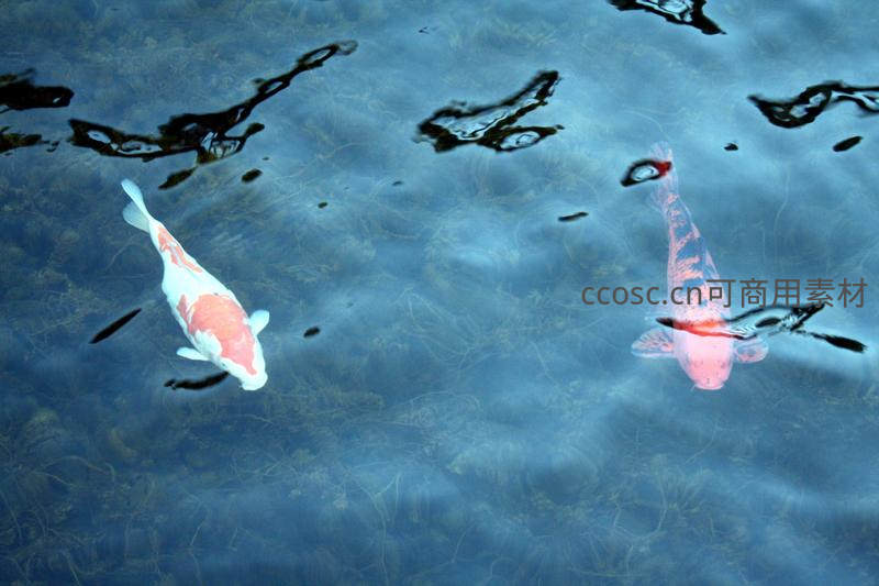池中双鲤,蓝水倒影如画