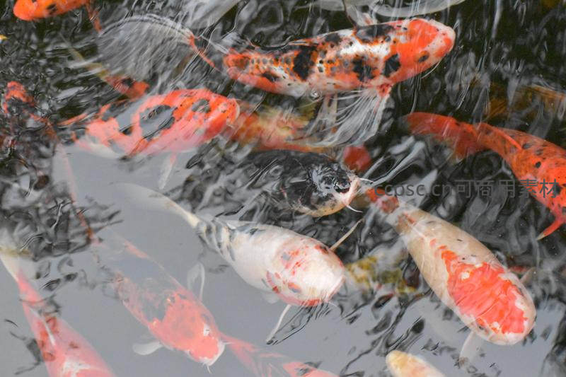 多条色彩斑斓的锦鲤在清澈池水中悠然游弋,红、白、黑三色交织,水波荡漾倒影摇曳,充满生机与宁静之美。