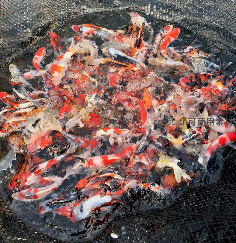 黑色渔网兜中挤满活泼锦鲤,水花四溅,鱼儿翻腾挣扎,展现养殖捕捞的生动场景,充满动感与活力。