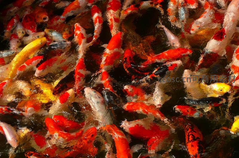 众多色彩鲜艳的锦鲤在清澈水面下自由游弋,红、白、黄、黑等颜色交织,形成一幅生动活泼的水中画卷。