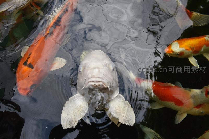 一条纯白锦鲤正从水中探出头部,双鳍展开,眼神直视镜头,周围红白锦鲤相伴,水面泛起圈圈涟漪,画面充满灵性。