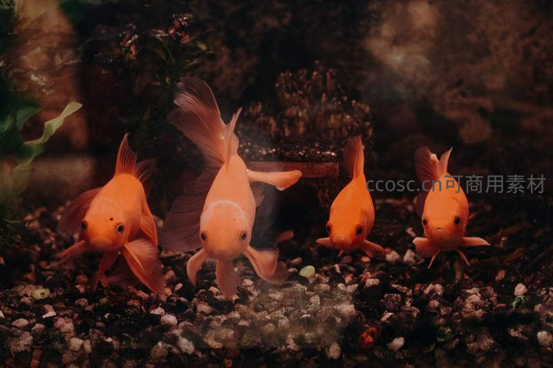 四尾金鱼在水族箱底觅食