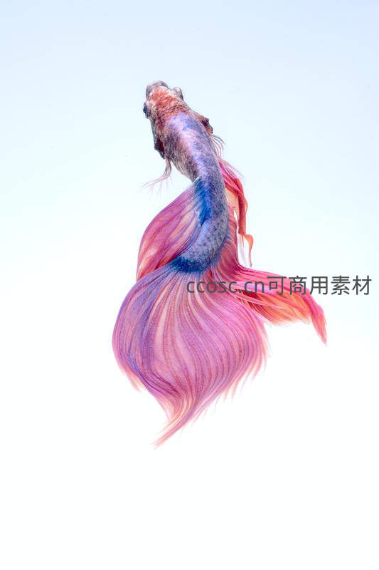 一只色彩绚丽的斗鱼在纯净的白色背景中舒展着宽大而飘逸的粉紫色尾鳍,其身体呈流线型,宛如水中芭蕾舞者,展现出极致的柔美与生命力。