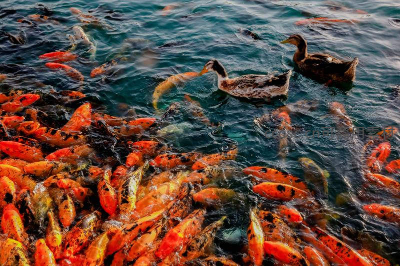 鸭伴锦鲤戏水间,动静相宜乐融融