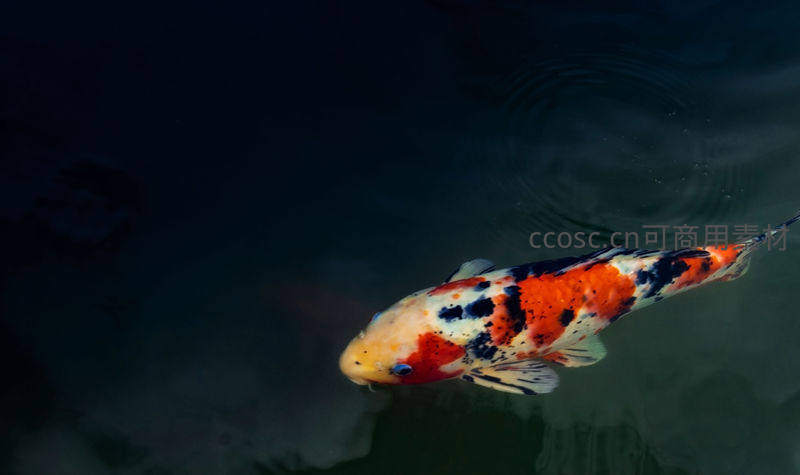 一条色彩鲜艳的锦鲤在幽暗水面缓缓游动,身后荡开圈圈涟漪,光影交错间凸显其鳞片纹理与灵动姿态,营造出静谧而富有生命力的画面。