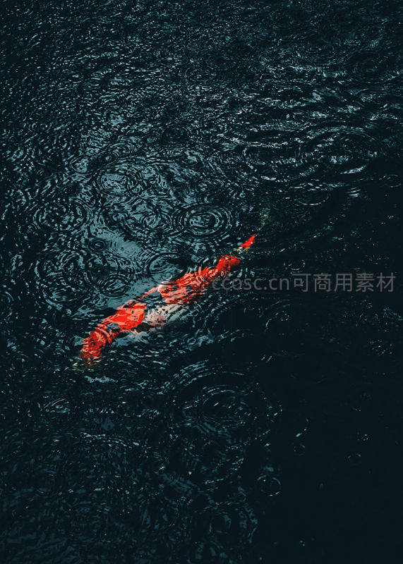 一条鲜艳的红白锦鲤在雨滴敲击的水面上缓缓游动,层层涟漪扩散开来,画面宁静而富有诗意,充满禅意。
