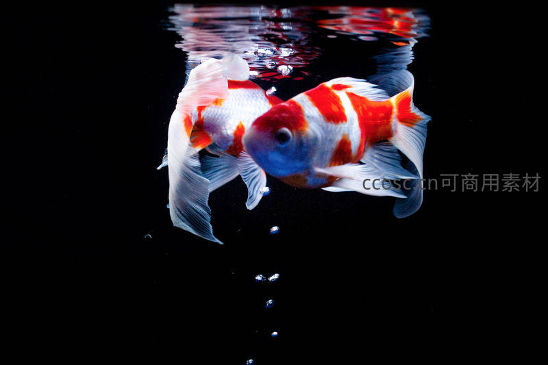 两只色彩斑斓的锦鲤在纯黑背景下相对游动,仿佛深情对视,水泡上升,光影流动,构成一幅充满艺术感的画面。
