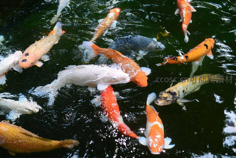 池中锦鲤色彩斑斓,红、白、橙、黑交织,在水面上划出层层涟漪,象征吉祥如意,是东方庭院的经典景致。