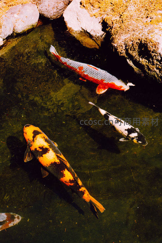 石畔锦鲤戏水,斑斓色彩映绿波