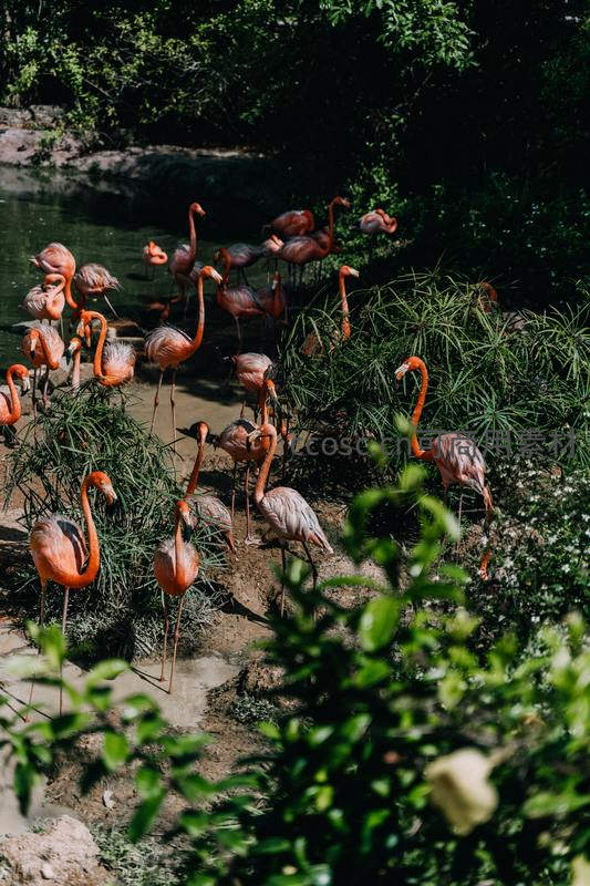 丛林溪边火烈鸟悠然漫步,绿意盎然