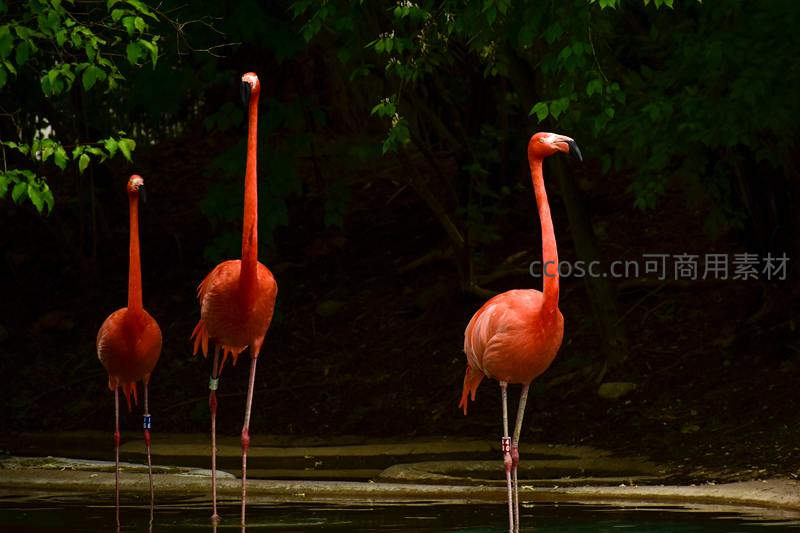 三只火烈鸟静立水边绿荫下的剪影