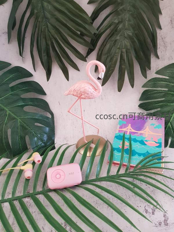 粉色火烈鸟摆件搭配龟背竹叶片、便携播放器和彩色笔记本,营造出清新甜美的桌面氛围,充满夏日度假风情与生活仪式感。