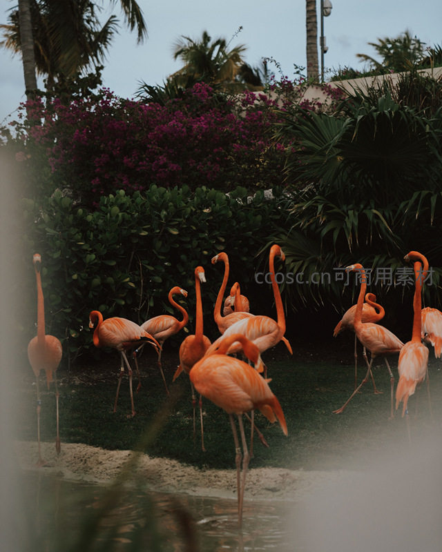 一群优雅的粉红火烈鸟在热带花园的水边栖息,背景是茂盛的绿植和盛开的紫花,构成一幅宁静而生动的自然画卷。