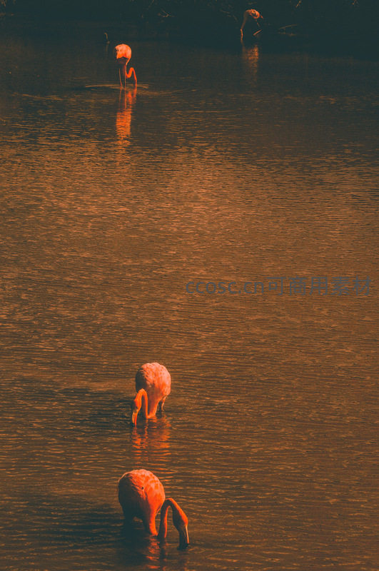 夕阳余晖洒满水面,几只火烈鸟在金光粼粼的水中低头觅食,身影朦胧,倒影随波轻晃,营造出温暖诗意的黄昏自然景象。