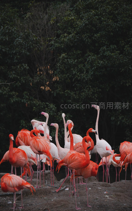 一群火烈鸟聚集在树林边缘的泥地上,粉红与白色的羽毛在深绿背景中格外醒目,它们或站立或低头,构成一幅生动的自然生态画面。