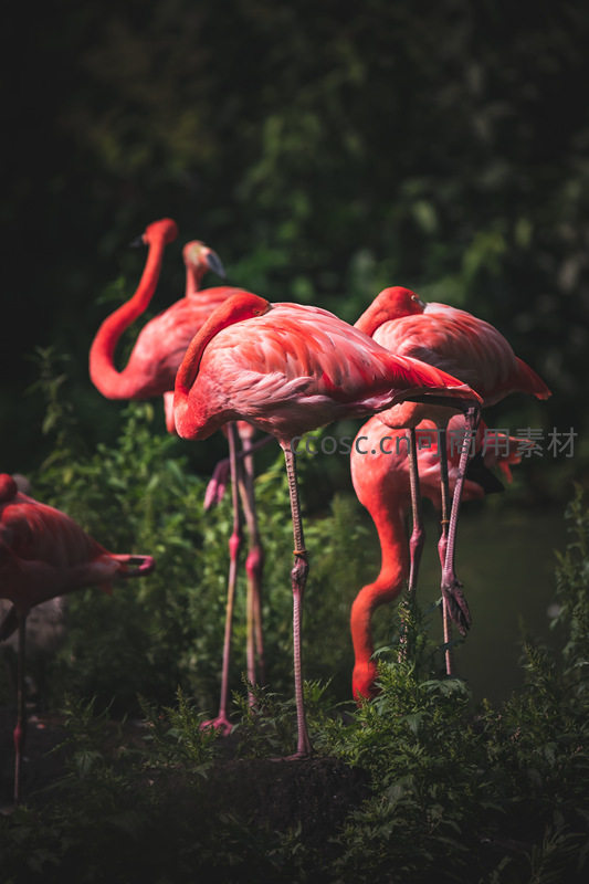 火烈鸟群栖于繁茂绿植间,鲜亮粉红羽毛与翠绿背景相映成趣,长腿稳立泥地,展现出热带湿地生态系统的蓬勃生命力。