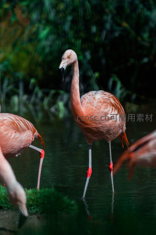 一只火烈鸟站在幽暗的湿地水中,头部微侧,目光锐利地凝视前方,其粉橙色的羽毛与深绿背景形成鲜明对比,充满野性之美。